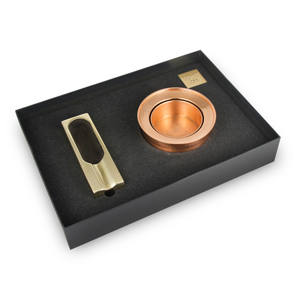 Coho Patron Pleasure Edition: Dark&Gold döküm puro küllüğü + dövme bakır viski soğutucu hediye seti. El yapımı lüks aksesuarlar, puro ve viski keyfini kutlamak için tasarlandı. Viski soğutucu 12 dakikada 25°C’den 19°C’ye indirir, 2 saate kadar serin tutar. Zamanla patina geliştiren premium malzemeler. Özel kutulu, sınırlı üretim